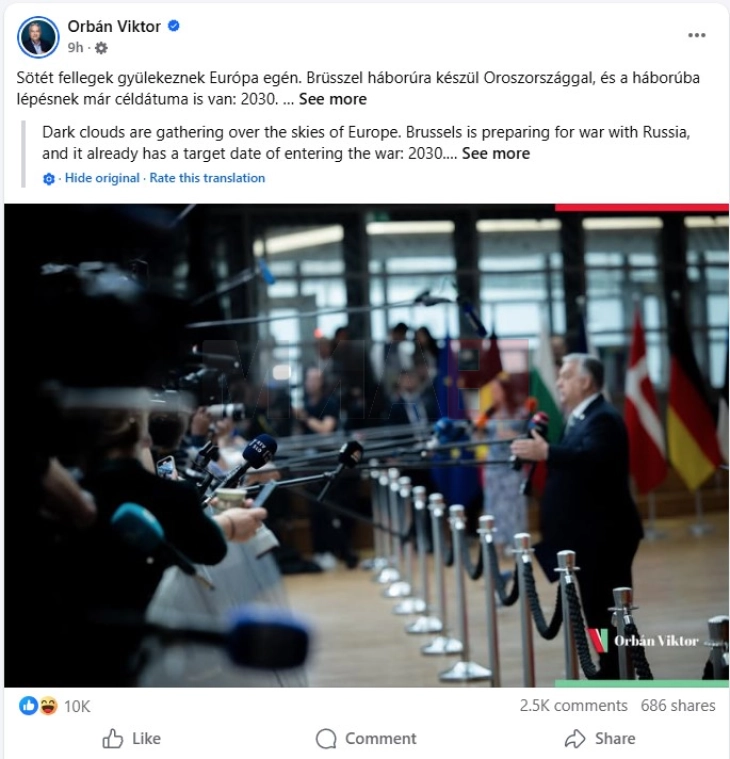 На својата Фејсбук страница, Орбан напиша дека целта на програмата за вооружување што ја покрена Брисел е Европската Унија да биде подготвена за војна до 2030 година, што е и целниот датум за забрзана процедура за членство на Украина во ЕУ, пренесува Хирадо.